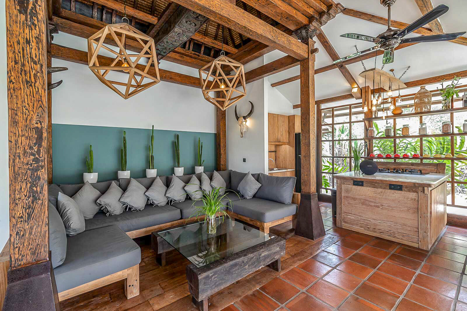 Villa Oscar is the latest edition to the Kuno Villas resort. This is an ideal choice for families or larger groups of friends. It embodies a perfect union between high-end modern specs and gorgeously restored, timeless antique artifacts. The villa’s unmistakable calm can be attributed to its distinct water theme, featuring a beautiful wrap-around swimming pool, a waterfall and freshwater ponds extending around the property. The villa has three bedrooms, and a large, open-plan living area and kitchen combined, as well as a sizable outdoor communal terrace area.