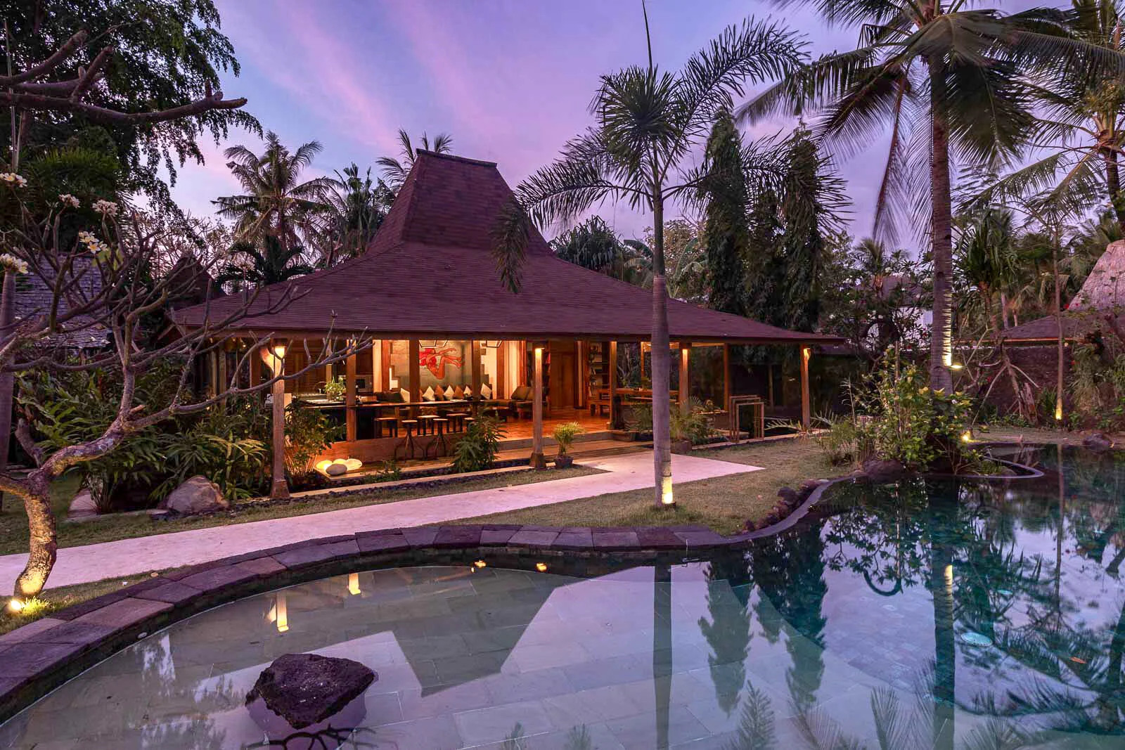 Villa Jade represents the birthplace of the entire resort. Named after our beautiful daughter, it was the first villa we created, and the space is the perfect option for a family retreat. This is the largest villa in terms of overall space, featuring a spacious garden area with a saltwater swimming pool, a wrap-around moat and a shallow end for the kids. The villa boasts three sizable bedrooms, two of which are housed within the main joglo building, with the third one being a detached poolside option.